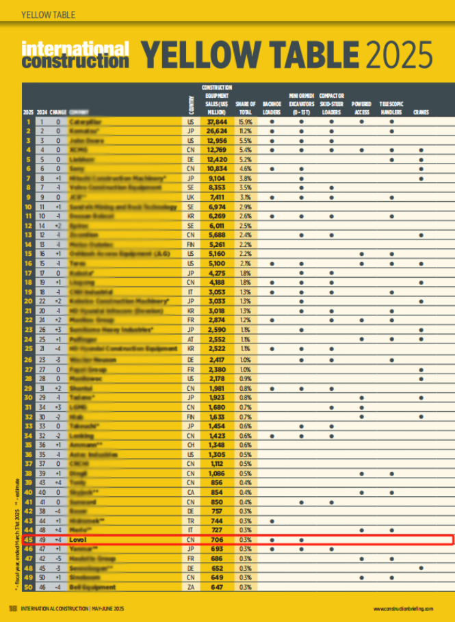 近日,全球工程機(jī)械行業(yè)權(quán)威資訊機(jī)構(gòu)KHL旗下的《International Construction》雜志發(fā)布了備受矚目的《Yellow Table 2025》榜單。中國工程機(jī)械企業(yè)雷沃重工在此次榜單中表現(xiàn)卓越,以7.06億美元的銷售額躍居全球第45位,較2024年大幅提升了4個(gè)名次,進(jìn)一步彰顯了其在工程機(jī)械行業(yè)的硬核實(shí)力。