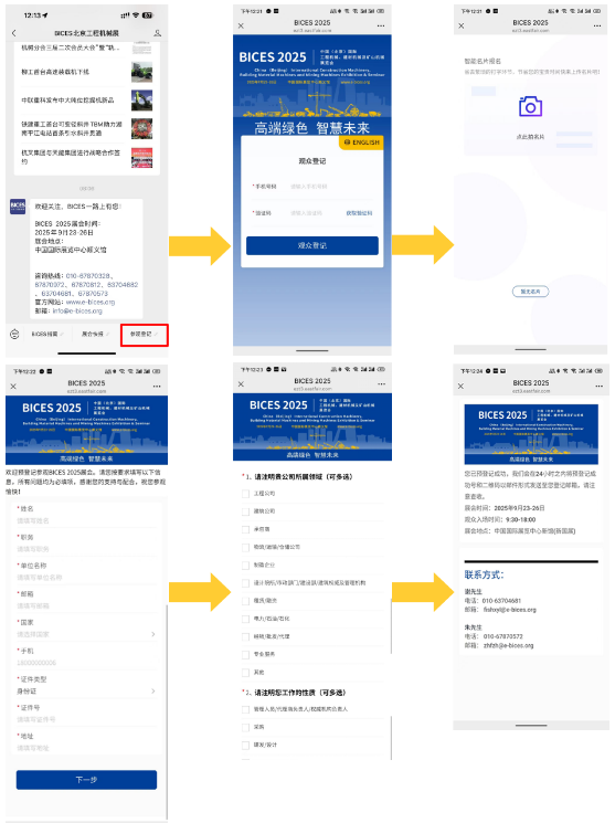 BICES 2025觀眾預登記可通過官方微信公眾號”BICES北京工程機械展”的參觀預登記欄目進入登記,或是通過協會官網(www.cncma.org)首頁頭條BICES 2025專題進入展會官網www.e-bices.org(或直接打開展會官網)觀眾服務欄目進入登記、填寫基本信息、填寫調查問卷,輕松三步即可完成。