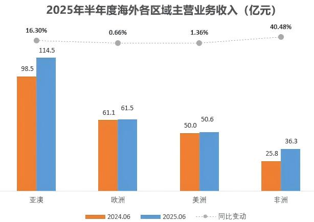 各區域收入情況如下:亞澳區域114.55億元,增長16.3%;歐洲區域61.52億元,增長0.66%;美洲區域50.65億元,增長1.36%;非洲區域36.30億元,增長40.48%。